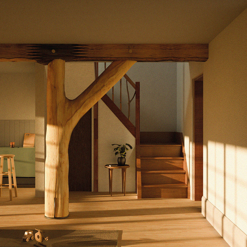 Drawing from principles of Continuous Cover Forestry (CCF), which promotes biodiversity and avoids clear-cutting, the proposal challenges industrial standards that deem naturally formed timber unusable. Irregularities such as forks, curves, knots, and spirals are understood not as flaws, but as structural responses to wind, light, and gravity. These forms are integrated into homes through bespoke interventions: a curved offcut becomes a window seat, a tree fork frames an opening, a juvenile trunk replaces a banister post.